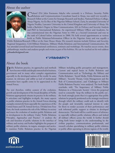 Public Relations practice, its approaches and methods have become widely and deeply entrenched in business, government and in many other complex organizations especially in the developed nations of the world. In same manner, its relevance and utility as tool of institutional promotion have equally come to be appreciated in the Armed Forces. The text therefore, within context of the evolution, growth and development of the broad discipline of Public Relations appropriately situates its practice in the military. It articulates and highlights in-depth, the many aspects to public relations practice in the armed Forces drawing examples extensively from especially the experiences of the United States and UK Armed Services. Divided into Four Parts, the book examines the role of the Military in society and traces the evolution of modern public Relations and its development in the military. Under 'Public Relations Principles, Approaches and Practice", it analyses the role and function of public relations in the interface of military and society, and further highlight the purpose of military public relations, its targets, strategies and tactics. It examines Public Relations practice in the Nigerian Military including public perception and management. Current and topical Issues in Public Relations and Communication such as 'Technology, the Military and Public Relations', 'Social Media, Public Relations and the Military', 'Security Threats, Crisis Management and the Role of Communications', and 'Challenges to Military Public Relations Practice' were analyzed. The book finally concludes with 'The Importance of Military Public Relations in a Democratic Society'. Given the perpetual need to constantly `keep the military in the public eye', the book strongly posits that it is appropriate that public relations be properly positioned as the strategic machinery through which the military could seek to identify with the people and invariably, national interest in order for them to render accounts of their performances and seek informed public support as obtains in developed democracies. This book will be a useful source of reference to especially military public relations officers and indeed all military officers across the world. It further should bring forth better insight to the understanding by the civilian populace, communications professionals, and research scholars specializing in military public relations or public affairs operating in diverse regions of the world.
