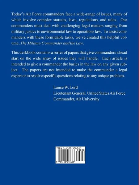 Today's Air Force commanders face a wide-range of issues, many of which involve complex statutes, laws, regulations, and rules. Our commanders must deal with challenging legal matters ranging from military justice to environmental law to operations law. To assist commanders with these formidable tasks, we've created this helpful volume, The Military Commander and the Law. This deskbook contains a series of papers that give commanders a head start on the wide array of issues they will handle. Each article is intended to give a commander the basics in the law on any given subject. The papers are not intended to make the commander a legal expert or to resolve specific questions relating to any unique problem. Lance W. Lord Lieutenant General, United States Air Force Commander, Air University