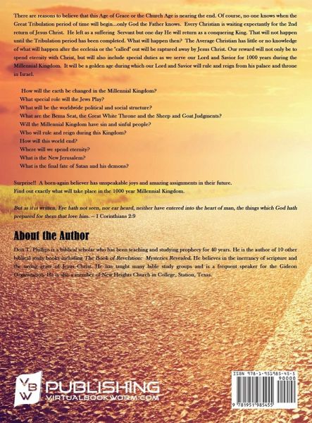 There are reasons to believe that this Age of Grace or the Church Age is nearing the end. Of course, no one knows when the Great Tribulation period of time will begin...only God the Father knows. Every Christian is waiting expectantly for the 2nd return of Jesus Christ. He left as a suffering Servant but one day He will return as a conquering King. That will not happen until the Tribulation period has been completed. What will happen then? The Average Christian has little or no knowledge of what will happen after the ecclesia or the "called" out will be raptured away by Jesus Christ. Our reward will not only be to spend eternity with Christ, but will also include special duties as we serve our Lord and Savior for 1000 years during the Millennial Kingdom. It will be a golden age during which our Lord and Savior will rule and reign from his palace and throne in Israel. How will the earth be changed in the Millennial Kingdom? What special role will the Jews play? What will be the worldwide political and social structure? What are the Bema Seat, the Great White Throne and the Sheep and Goat Judgments? Will the Millennial Kingdom have sin and sinful people? Who will rule and reign during this Kingdom? How will this world end? Where will we spend eternity? What is the New Jerusalem? What is the final fate of Satan and his demons?