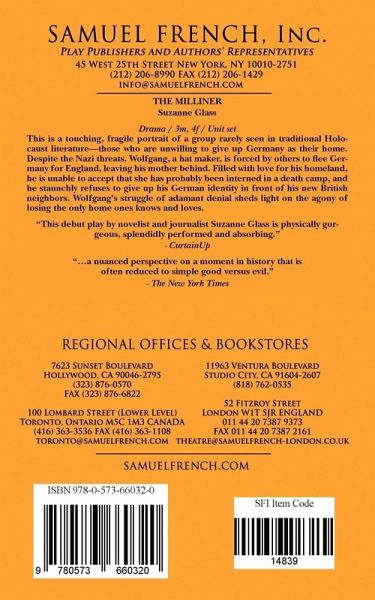 Drama / 3m, 4f / Unit set This is a touching, fragile portrait of a group rarely seen in traditional Holocaust literaturethose who are unwilling to give up Germany as their home, despite the Nazi threats. Wolfgang, a hat maker, is forced by others to flee Germany for England, leaving his mother behind, who refuses to go. Filled with love for his homeland, he is unable to accept that she has probably been interned in a death camp, and he staunchly refuses to give up his German identity in front of his new British neighbors. Wolfgangs struggle of adamant denial sheds light on the agony of losing the only home ones knows and loves. This debut play by novelist and journalist Suzanne Glass is physically gorgeous, splendidly performed and absorbing. CurtainUp. )a nuanced perspective on a moment in history that is often reduced to simple good versus evil. The New York Times