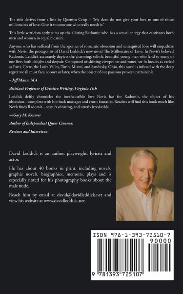 The title derives from a line by Quentin Crisp - "My dear, do not give your love to one of those millionaires of love. Give it to someone who really needs it." This little witticism aptly sums up the alluring Radomir, who has a sexual energy that captivates both men and women in equal measure. Anyone who has suffered from the agonies of romantic obsession and unrequited love will empathize with Nevis, the protagonist of David Leddick's new novel The Millionaire of Love. In Nevis's beloved Radomir, Leddick accurately depicts the charming, selfish, beautiful young men who lend so many of our lives both delight and despair. Composed of shifting viewpoints and tones, set in locales as varied as Paris, Crete, the Loire Valley, Turin, Miami, and Sandusky, Ohio, this novel is infused with the deep regret we all must face, sooner or later, when the object of our passions proves unattainable. - Jeff Mann, MA Assistant Professor of Creative Writing, Virginia Tech This moody and introspective novel of obsession follows the intertwined 'but not quite' relationship between the wealthy patron Nevis and his would-be charge, Radomir, an unconventional beauty thirty years younger. But this is no modern-day Death in Venice; Nevis is far too self-aware of his history with men, and that history forms part of this contemplative novel. Radomir, on the other hand, becomes more than the unattainable prize, the heartbreaker, the 'millionaire of love,' as we see how he has carefully constructed himself over time. Nevis and Radomir spend the years spinning through each other's orbits, changing each other's lives as they dissect their own. Leddick deftly characterizes each of them as well as minor characters, and gives Nevis and Radomir the authentic voices that carry the book. -Jonathan Cohen Author of Bear Like Me Leddick deftly chronicles the inexhaustible love Nevis has for Radomir, the object of his obsession-complete with hot back massages and erotic fantasies. Readers will find this book much like Nevis finds Radomir-sexy, fascinating, and utterly irresistible. -Gary M. Kramer Author of Independent Queer Cinema: Reviews and Interviews The "millionaire of love" is richly loved and desired, yet he is unable or unwilling to return the favor. That doesn't stop him from taking advantage of the one who unselfishly loves and cares for him the most. In his most recent novel, David Leddick creates a tapestry of feeling and unfilled desires that is unsettlingly familiar, a mosaic of introspection and inner conflict that is compelling and stunningly beautiful. Leddick aptly explores the overlapping contours of undying passion and never-ending obsession, of heroic persistence and dreaded folly that any of us can fall victim to when faced with unrequited love. Passionate, unrelenting, obsessive, and beautiful, The Millionaire of Love will capture your heart. -David M. Pierce Author of Elf Child &nb