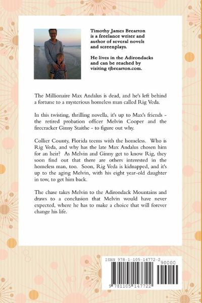 The Millionaire Max Andalus is dead, and he's left behind a fortune to a mysterious homeless man called Rig Veda. In this twisting, thrilling novella, it's up to Max's friends - the retired probation officer Melvin Cooper and the firecracker Ginny Staithe - to figure out why. Collier County, Florida teems with the homeless. Who is Rig Veda, and why has the late Max Andalus chosen him for an heir? As Melvin and Ginny get to know Rig, they soon find out that there are others interested in the homeless man, too. Soon, Rig Veda is kidnapped, and it's up to the aging Melvin, with his eight year-old daughter in tow, to get him back. The chase takes Melvin all the way to the Adirondack Mountains, to a house Max Andalus used to own, and draws to a conclusion that Melvin would have never expected, where he has to make a choice that will forever change his life.