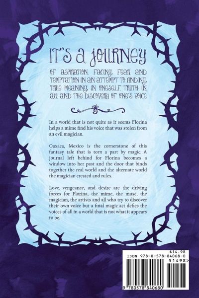 The Mime, is a story that is set in Oaxaca, Mexico about a young girl, Florina who helps a mime retrieve his voice that was stolen from an evil magician, who changed the world; in doing so she discovers her own voice and changes the world back to a better place. It's a story about self-discovery, finding one's voice and using it to change the world. In a world that is not quite as it seems Florina helps a mime find his voice that was stolen from an evil magician. Oaxaca, Mexico is the cornerstone of this fantasy tale that is torn a part by magic. A journal left behind for Florina becomes a window into her past and the door that binds together the real world and the alternate world the magician created and rules. It's a journey of aspiration, facing fear, and temptation in an attempt to finding true meaning in oneself, truth in all and the discovery of one's voice. Love, vengeance, and desire are the driving forces for Florina, the mime, the muse, the magician, the artists and all who try to discover their own voice but a final magic act defies the voices of all in a world that is not what it appears to be. "A fantastical middle-grade story about finding the power in your voice. Tutalo knows exactly where he's taking his reader, and the dark motifs transform into something quite brilliant, leading the narrative down an intricate path of intrigue and twists. The city of Oaxaca is drawn exquisitely to the point of making it into a magical place, transporting the reader. The Mime is a wonderfully realized fantasy that is wholly unique in the genre." Self-Publishing Review, ¿¿¿¿¿ " A dark fable in the vein of Neil Gaiman or Joan Aikin." ¿¿Self-Publishing Review, ¿¿¿¿¿