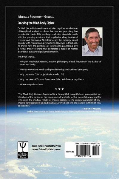 Cracking the Mind-Body Cipher Dr. Niall (Jock) McLaren is an Australian psychiatrist who uses philosophical analysis to show that modern psychiatry has no scientific basis. This startling conclusion dovetails neatly with the growing evidence that psychiatric drug treatment is crude and damaging. Needless to say, this message is not popular with mainstream psychiatrists. However, in this book, he shows how the principles of information processing give a formal theory of mind that generates a model of mental disorder as a psychological phenomenon. This book shows... How, for ideological reasons, modern philosophy misses the point of the duality of mind and body; How to resolve the mind-body problem using well-defined principles; Why the entire DSM project is doomed to fail; Why the ideas of Thomas Szasz have failed to influence psychiatry; Where we go from here. "The Mind Body Problem Explained is a thoughtful, insightful and provocative exploration of the nature of the human mind, and sets forth a powerful argument for rethinking the medical model of mental disorders. The current paradigm of psychiatric care has failed us, and Niall McLaren's book will stir readers to think of new possibilities." --Robert B. Whitaker, author Mad in America: Bad Science, Bad Medicine, and the Enduring Mistreatment of the Mentally Ill "It is impossible to do justice to this ambitious, erudite, and intrepid attempt to dictate to psychiatry a new, 'scientifically-correct' model theory. The author offers a devastating critique of the shortcomings and pretensions of psychiatry, not least its all-pervasive, jargon-camouflaged nescience." --Sam Vaknin, PhD, author Malignant Self Love: Narcissism Revisited From Future Psychiatry Press www.FuturePsychiatry.com MED105000 Medical : Psychiatry - General PHI026000 Philosophy : Criticism PSY018000 Psychology : Mental Illness