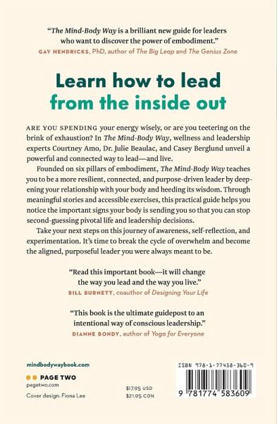 Learn how to lead from the inside out. Are you spending your energy wisely, or are you teetering on the brink of exhaustion? Whether you're an executive, an entrepreneur, or a community organizer, embodiment can help you find meaningful success in life and leadership. In The Mind-Body Way, wellness and leadership experts Courtney Amo, Dr. Julie Beaulac, and Casey Berglund use their decades of experience to reveal how tapping into the intuitive wisdom of your body makes you a better, happier leader-no matter the unique challenges of your everyday. With a step-by-step approach founded on six pillars of embodiment, The Mind-Body Way teaches you how to be a more resilient, connected, and purpose-driven leader by deepening your relationship with your body and heeding its wisdom. Through meaningful stories and accessible exercises, this practical guide will teach you how to interpret your body's signals and use that knowledge to curb self-doubt and become a stronger, more agile leader in this increasingly complex world. Discover a new way of leading that is powerful, connected, and aligned with purpose, a way that heals you and invigorates you to move through massive change-all while inspiring and empowering others.