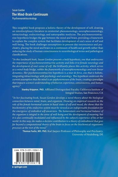 "In this landmark book, Susan Gordon presents a bold hypothesis, one that underscores the importance of psychoneurointracrine activity and links it to female neurology and the development of one's sense of self. She brilliantly places this activity, which serves as a mind-body bridge, within the frameworks of neurophenomenology and non-linear dynamics. Her psychoneurointracrine hypothesis is a tour de force, one that is holistic, integrating intracrinology with psychology and neurology. This hypothesis undercuts the current assumption that the mind is an epiphenomenon of the brain, creating a paradigm that impacts science's understanding of behavior, experience, consciousness, and human agency."