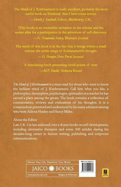 New Reformated Edition The Mind of J Krishnamurti is a must read for those who want to know the brilliant mind of J. Krishnamurti. Call him what you like, a philosopher, theosophist, psychologist, spiritualist or a teacher he has carved a place among the greats. The book contains a collection of commentaries, reviews and evaluations of his thoughts. It is a compendium perceived and understood by his many admirers among who were Aldous Huxley and Henry Miller.
