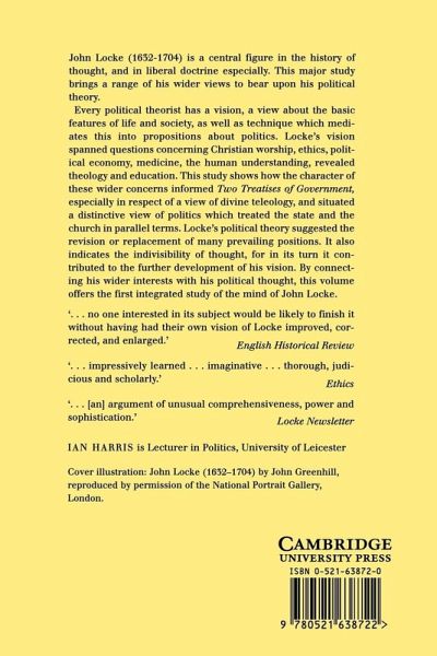 John Locke (1632-1704) is a central figure in the history of thought, and in liberal doctrine especially. This major study brings a range of his wider views to bear upon his political theory. Every political theorist has a vision, a view about the basic features of life and society, as well as technique which mediates this into propositions about politics. Locke's vision spanned questions concerning Christian worship, ethics, political economy, medicine, the human understanding, revealed theology and education. This study shows how the character of these wider concerns informed Two Treatises of Government, especially in respect of a view of divine teleology, and situated a distinctive view of politics which treated the state and the church in parallel terms.