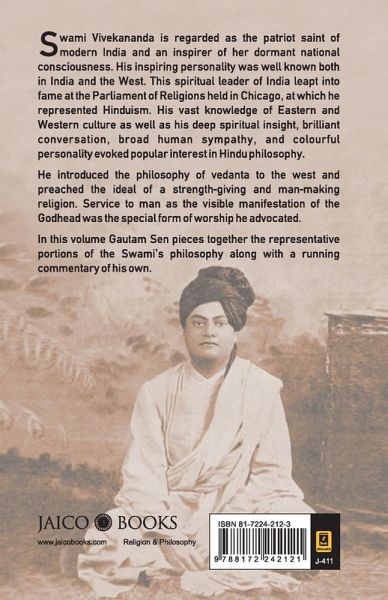 New Enlarged Edition Swami Vivekananda is regarded as the patriot saint of modern India and an inspirer of her dormant national consciousness. His inspiring personality was well known both in India and the West. This spiritual leader of India leapt into fame at the Parliament of Religions held in Chicago, at which he represented Hinduism. His vast knowledge of Eastern and Western culture as well as his deep spiritual insight, brilliant conversation, broad human sympathy, and colourful personality evoked popular interest in Hindu philosophy. He introduced the philosophy of vedanta to the west and preached the ideal of a strength-giving and man-making religion. Service to man as the visible manifestation of the Godhead was the special form of worship he advocated. In this volume Gautam Sen pieces together the representative portions of the Swami's philosophy along with a running commentary of his own.