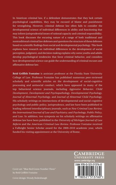 In American criminal law, if a defendant demonstrates that they lack certain psychological capabilities, they may be excused of blame and punishment for wrongdoing. However, criminal defense law often fails to consider the developmental science of individual differences in ability and functioning that may inform jurisprudential issues of rational capacity and responsibility in criminal law. This book discusses the excusing nature of a range of both traditional and non-traditional criminal law defenses and questions the structure of these defenses based on scientific findings from social and developmental psychology. This book explores how research on individual differences in the development of social perception, judgment and decision making explain why some youths and adults develop psychological tendencies that favor criminal behavior, and considers how developmental science can guide the understanding of criminal excuses and affirmative defense law.
