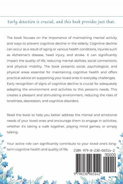 Don't wait until it's too late. This gentle guide helps you recognize what's often missed in the early stages - and respond with calm, care, and clarity. Equipped With Practical Exercises for Families & Caregivers. Cognitive decline in aging is a challenge that many families face, yet it often goes unnoticed until significant changes occur. Whether it's the early signs of dementia, mild cognitive impairment, or the onset of Alzheimer's disease, recognizing what's happening - and knowing how to respond - is essential. ¿¿¿¿¿¿¿The Mind of the Elderly is an essential guide for family members, caregivers, and anyone seeking to understand the complexities of mental aging and how to support their loved ones effectively. This book is especially helpful for those navigating the emotional and practical challenges of dementia - related conditions. It explores the early signs of cognitive decline, common misconceptions about aging, and practical strategies to improve mental well-being. It also sheds light on how inactivity or confusion in the elderly is often misinterpreted as simple frailty - when in fact it may signal deeper neurological changes. Inside this book, you'll discover:The importance of social, cognitive, and physical activities for brain health How to recognize early warning signs of dementia and cognitive decline Practical cognitive exercises and memory-strengthening techniques The role of family support in maintaining mental agility Strategies for overcoming passivity, resistance, and emotional withdrawal How to create a stimulating and engaging daily routine This book is not just about aging - it's about thriving in later years, even in the face of cognitive challenges. Whether your loved one has been diagnosed with mild memory loss or is showing the first subtle signs of dementia, The Mind of the Elderly offers compassionate, clear, and actionable guidance. Take the first step in understanding and supporting your loved ones today - with insight, empathy, and hope.