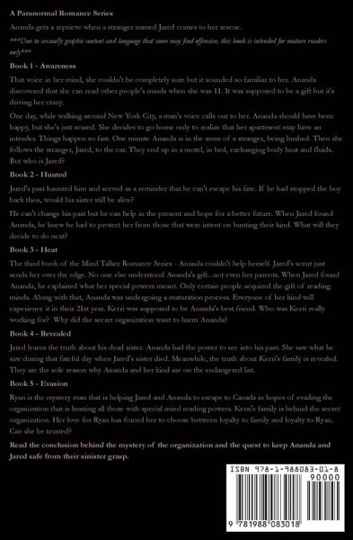 A Paranormal Romance Series Ananda gets a reprieve when a stranger named Jared comes to her rescue. ***Due to sexually graphic content and language that some may find offensive, this book is intended for mature readers only*** This complete series contains Books 1 to 5 Book 1 - Awareness That voice in her mind, she couldn't be completely sure but it sounded so familiar to her. Ananda discovered that she can read other people's minds when she was 11. It was supposed to be a gift but it's driving her crazy. Her parents can't understand her and the only person who can, her brother Ryan, is off to the university. Lonely and disoriented, Ananda runs off to New York. She thinks that in a city as big as that, there must be someone like her walking around. She instead meets Kerri, her best friend, with whom she cannot read thoughts, which is a welcome development. One day, while walking around New York City, a man's voice calls out to her. Ananda should have been happy; it was what she was in New York for. But she's just scared. She decides to go home only to realize that her apartment may have an intruder. Things happen so fast. One minute Ananda is in the arms of a stranger, being hushed. Then she follows the stranger, Jared, to the car. They end up in a motel, in bed, exchanging body heat and fluids. But who is Jared? Book 2 - Hunted The second book of the Mind Talker Romance Series - Jared's past haunted him and served as a reminder that he can't escape his fate. If he had stopped the boy back then, would his sister still be alive? Jenny was the love of Jared's life until he discovers she was living a double life. Jenny was part of a secret organization that was bent on hunting him. He can't change his past but he can help in the present and hope for a better future. When Jared found Ananda, he knew he had to protect her from those that were intent on hunting their kind. What will they decide to do next? Book 3 - Heat The third book of the Mind Talker Romance Series - Ananda couldn't help herself. Jared's scent just sends her over the edge. No one else understood Ananda's gift...not even her parents. When Jared found Ananda, he explained what her special powers meant. Only certain people acquired the gift of reading minds. Along with that, Ananda was undergoing a maturation process. Everyone of her kind will experience it in their 21st year. Kerri was supposed to be Ananda's best friend. Who was Kerri really working for? Why did the secret organization want to harm Ananda? Book 4 - Revealed Jared learns the truth about his dead sister. Ananda had the power to see into his past. She saw what he saw during that fateful day when Jared's sister died. Meanwhile, the truth about Kerri's family is revealed. They are the sole reason why Ananda and her kind are on the endangered list. Follow Ananda and Jared as they navigate through their feelings for each other amidst the danger that is hunting them. Book 5 - Evasion The fifth and final book of the Mind Talker Romance Series - Ryan is the mystery man that is helping Jared and Ananda to escape to Canada in hopes of evading the organization that is hunting all those with special mind reading powers. Kerri's family is behind the secret organization. Her love for Ryan has forced her to choose between loyalty to family and loyalty to Ryan. Can she be trusted? Read the conclusion behind the mystery of the organization and the quest to keep Ananda and Jared safe from their sinister grasp.