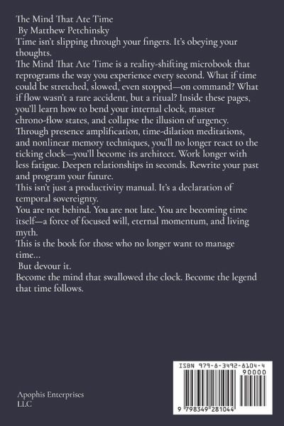 The Mind That Ate Time By Matthew Petchinsky Time isn't slipping through your fingers. It's obeying your thoughts. The Mind That Ate Time is a reality-shifting microbook that reprograms the way you experience every second. What if time could be stretched, slowed, even stopped-on command? What if flow wasn't a rare accident, but a ritual? Inside these pages, you'll learn how to bend your internal clock, master chrono-flow states, and collapse the illusion of urgency. Through presence amplification, time-dilation meditations, and nonlinear memory techniques, you'll no longer react to the ticking clock-you'll become its architect. Work longer with less fatigue. Deepen relationships in seconds. Rewrite your past and program your future. This isn't just a productivity manual. It's a declaration of temporal sovereignty. You are not behind. You are not late. You are becoming time itself-a force of focused will, eternal momentum, and living myth. This is the book for those who no longer want to manage time... But devour it. Become the mind that swallowed the clock. Become the legend that time follows.