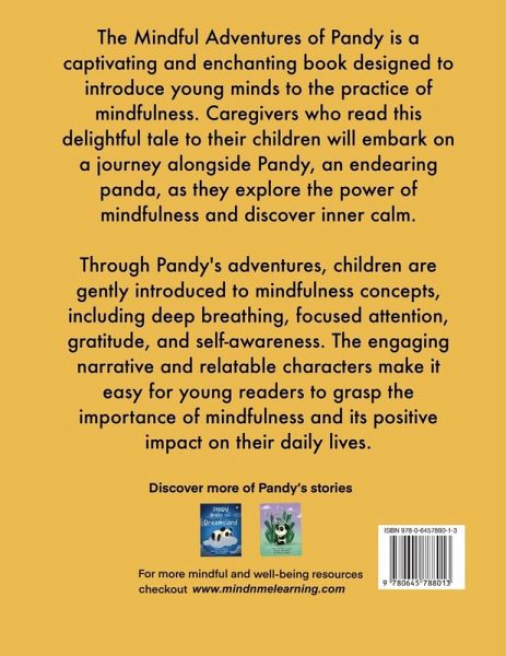 Open your child's mind to the wonderful world of mindfulness with our captivating children's book! Take your child on a journey of self-discovery and relaxation and help your little one develop essential mindfulness skills for a happier, healthier life. Introduce your child to the incredible benefits of mindfulness and meditation with this charming children's book! The Mindful Adventures of Pandy is a caregiver's guide, to help their children embark on a magical journey of self-discovery and relaxation. Throughout the book, children will learn essential mindfulness techniques, including breathing exercises and visualization, to help them manage their emotions, reduce stress and anxiety, and cultivate a sense of calm and inner peace. Written with young children in mind, this delightful book is perfect for children aged 4-12, and is an excellent resource for parents, teachers, and caregivers who want to introduce mindfulness and meditation into their children's lives. With easy-to-follow exercises and guidance, this book will inspire your child to develop healthy habits for a happier, more balanced life. The Mindful Adventures of Pandy is more than just a book - it's a journey of self-discovery that your child will cherish for years to come. The children's Mindfulness book includes: · Meditations · Mindfulness · Breathing exercises · Emotional regulations · Positive affirmations · Daily goals · Many more Get your copy today and embark on the path to mindfulness with your little one!