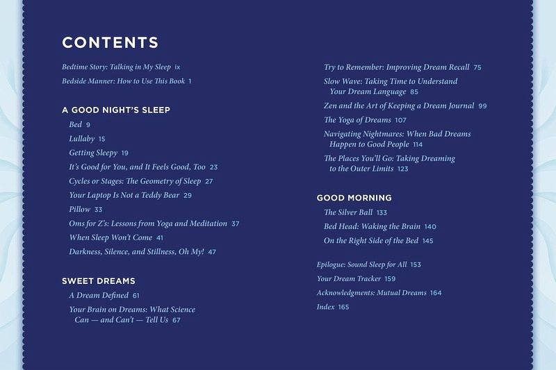 Bedtime Story: Talking in My Sleep Bedside Manner: How to Use This Book A Good Night's Sleep Bed Lullaby Getting Sleepy It's Good for You, and It Feels Good, Too! Cycles or Stages: The Geometry of Sleep Your Laptop Is Not a Teddy Bear Pillow Oms for Z's: Lessons from Yoga and Meditation When Sleep Won't Come Darkness, Silence, and Stillness, Oh My! Sweet Dreams A Dream Defined Your Brain on Dreams: What Science Can and Can't Tell Us Try to Remember: Improving Dream Recall Slow Wave: Taking Time to Understand Your Dream Language Zen and the Art of Keeping a Dream Journal The Yoga of Dreams Navigating Nightmares: When Bad Dreams Happen to Good People The Places You'll Go: Taking Dreaming to the Outer Limits Good Morning The Silver Ball Bed Head: Waking the Brain On the Right Side of the Bed Epilogue: Sound Sleep for All Your Dream Index Acknowledgments: Mutual Dreams Index