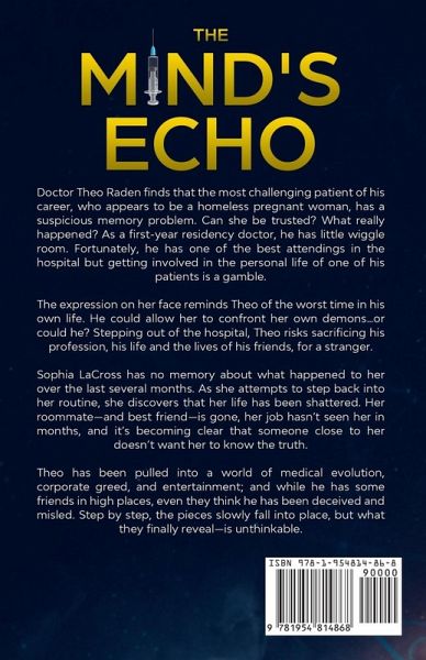 Doctor Theo Raden finds that the most challenging patient of his career, who appears to be a homeless pregnant woman, with memory problems. Can she be trusted? What really happened? As a first-year residency doctor, he has little wiggle room. Fortunately, he has one of the best attendings in the hospital but getting involved in the personal life of one of his patients is a gamble. The expression on her face reminds Theo of the worst time in his own life. He could allow her to confront her own demons...or could he? Stepping outside the hospital, Theo risks sacrificing his profession, his life, and his friends for a stranger. Sophia LaCross can't remember what happened over the last several months, and as she attempts to step back into her routine, she discovers that her life has been shattered. Her roommate and best friend is gone, her job hasn't seen her in months, and someone close to her doesn't want her to know the truth. Theo is pulled into a world of medical evolution, corporate greed, and entertainment. Theo has some friends in high places, but even they think he has been deceived and misled. Step by step, the pieces slowly fall into place, but what they finally reveal is unthinkable.