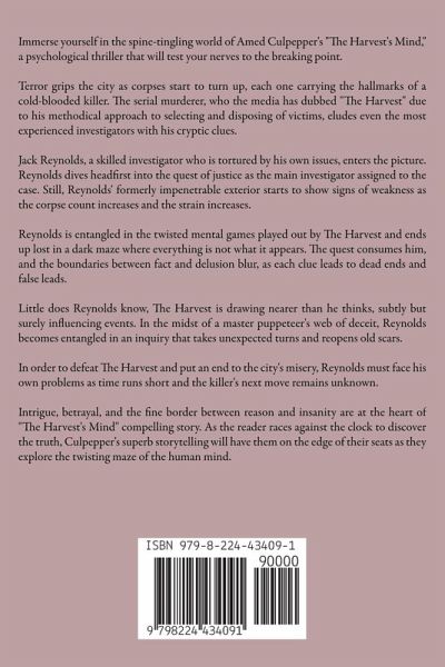 Immerse yourself in the spine-tingling world of Amed Culpepper's "The Harvest's Mind," a psychological thriller that will test your nerves to the breaking point. Terror grips the city as corpses start to turn up, each one carrying the hallmarks of a cold-blooded killer. The serial murderer, who the media has dubbed "The Harvest" due to his methodical approach to selecting and disposing of victims, eludes even the most experienced investigators with his cryptic clues. Jack Reynolds, a skilled investigator who is tortured by his own issues, enters the picture. Reynolds dives headfirst into the quest of justice as the main investigator assigned to the case. Still, Reynolds' formerly impenetrable exterior starts to show signs of weakness as the corpse count increases and the strain increases. Reynolds is entangled in the twisted mental games played out by The Harvest and ends up lost in a dark maze where everything is not what it appears. The quest consumes him, and the boundaries between fact and delusion blur, as each clue leads to dead ends and false leads. Little does Reynolds know, The Harvest is drawing nearer than he thinks, subtly but surely influencing events. In the midst of a master puppeteer's web of deceit, Reynolds becomes entangled in an inquiry that takes unexpected turns and reopens old scars. In order to defeat The Harvest and put an end to the city's misery, Reynolds must face his own problems as time runs short and the killer's next move remains unknown. Intrigue, betrayal, and the fine border between reason and insanity are at the heart of "The Harvest's Mind" compelling story. As the reader races against the clock to discover the truth, Culpepper's superb storytelling will have them on the edge of their seats as they explore the twisting maze of the human mind.
