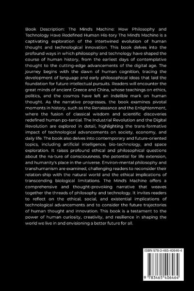 Book Description: The Mind's Machine: How Philosophy and Technology Have Redefined Human History The Mind's Machine is a captivating exploration of the intertwined evolution of human thought and technological innovation. This book delves into the profound ways in which philosophy and technology have shaped the course of human history, from the earliest days of contemplative thought to the cutting-edge advancements of the digital age. The journey begins with the dawn of human cognition, tracing the development of language and early philosophical ideas that laid the foundation for future intellectual pursuits. Readers will encounter the great minds of ancient Greece and China, whose teachings on ethics, politics, and the cosmos have left an indelible mark on human thought. As the narrative progresses, the book examines pivotal moments in history, such as the Renaissance and the Enlightenment, where the fusion of classical wisdom and scientific discoveries redefined human potential. The Industrial Revolution and the Digital Revolution are explored in detail, highlighting the transformative impact of technological advancements on society, economy, and daily life. The book also delves into contemporary and future-oriented topics, including artificial intelligence, biotechnology, and space exploration. It raises profound ethical and philosophical questions about the nature of consciousness, the potential for life extension, and humanity's place in the universe. Environmental philosophy and transhumanism are examined, challenging readers to reconsider their relationship with the natural world and the ethical implications of transcending biological limitations. The Mind's Machine offers a comprehensive and thought-provoking narrative that weaves together the threads of philosophy and technology. It invites readers to reflect on the ethical, social, and existential implications of technological advancements and to consider the future trajectories of human thought and innovation. This book is a testament to the power of human curiosity, creativity, and resilience in shaping the world we live in and envisioning a better future for all.