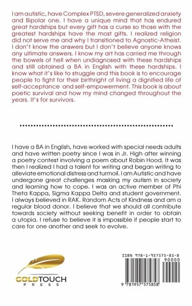 I am autistic, have Complex PTSD, severe generalized anxiety and Bipolar one. I have a unique mind that has endured great hardships but every gift has a curse so those with the greatest hardships have the most gifts. I realized religion did not serve me and why I transitioned to Agnostic-Atheist. I don't know the answers but I don't believe anyone knows any ultimate answers. I know my art has carried me through the bowels of hell when undiagnosed with these hardships and still obtained a BA in English with these hardships. I know what it's like to struggle and this book is to encourage people to fight for their birthright of living a dignified life of self-acceptance and self-empowerment. This book is about poetic survival and how my mind changed throughout the years. It's for survivors.