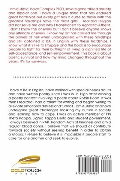 I am autistic, have Complex PTSD, severe generalized anxiety and Bipolar one. I have a unique mind that has endured great hardships but every gift has a curse so those with the greatest hardships have the most gifts. I realized religion did not serve me and why I transitioned to Agnostic-Atheist. I don't know the answers but I don't believe anyone knows any ultimate answers. I know my art has carried me through the bowels of hell when undiagnosed with these hardships and still obtained a BA in English with these hardships. I know what it's like to struggle and this book is to encourage people to fight for their birthright of living a dignified life of self-acceptance and self-empowerment. This book is about poetic survival and how my mind changed throughout the years. It's for survivors.