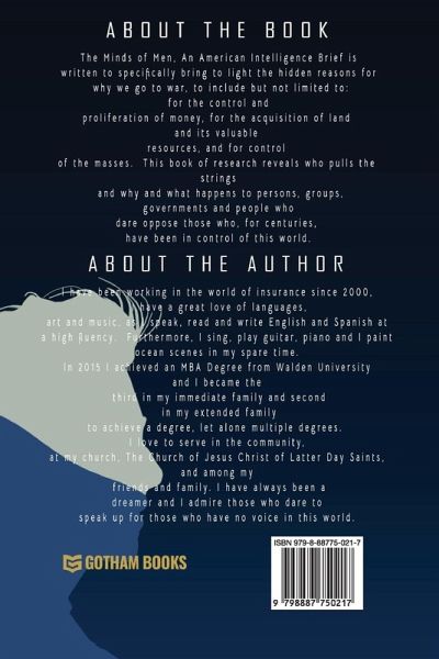 The Minds of Men, An American Intelligence Brief is written to specifically bring to light the hidden reasons for why we going to war, to include but not limited to: for the control and proliferation of money, for the acquisition of land and its valuable resources, and for control of the masses. This book of research reveals who pulls the strings and why and what happens to persons, groups, governments and people who dare oppose those who, for centuries, have been in control of this world.
