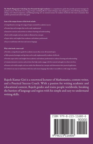 The Mind's Playground: Unlocking Your Potential through Academics is a comprehensive guide that provides practical strategies for academic success. This book covers a range of topics, including effective study techniques, time management, critical thinking and problem-solving, cross-cultural competence, and lifelong learning. It is an essential resource for students of all levels who want to maximize their academic potential and achieve their goals. Some of the unique features of this book include: ¿ Comprehensive coverage of a range of topics essential for academic success ¿ Practical tips and strategies that can be easily implemented ¿ Interactive exercises and activities to enhance learning and understanding ¿ Real-world examples and case studies to illustrate key concepts ¿ Expert advice and insights from academics and industry professionals ¿ Easy-to-read format with clear and concise language Why is this book a must-read? ¿ Provides a comprehensive guide for academic success that covers all essential topics ¿ Offers practical strategies and tips that can be easily implemented by students of all levels ¿ Provides expert advice and insights from academics and industry professionals to enhance learning and understanding ¿ Contains interactive exercises and activities that help readers engage with the material and apply it to their own lives ¿ Presents real-world examples and case studies that illustrate key concepts and demonstrate their practical application ¿ Is written in an easy-to-read format with clear and concise language that makes it accessible to a wide range of readers.