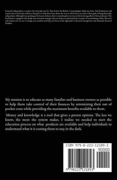 Financial independence is a goal a lot of people aim for. This book is for Barbers. Cosmetologist, Make-up Artist, Nail Technicians and anyone else in the beauty industry. My goal is to help them learn about the ways in which they can achieve their goals of being financially independent. Although I am speaking to the beauty industry, their is something for everyone in this book regardless of their profession. This book book is equipped with simple and consistent strategies that can help you understand the concepts of accumulating wealth. The tools and vehicles you can use to change your mindset and help you focus on the right path to financial management and ultimately financial freedom.