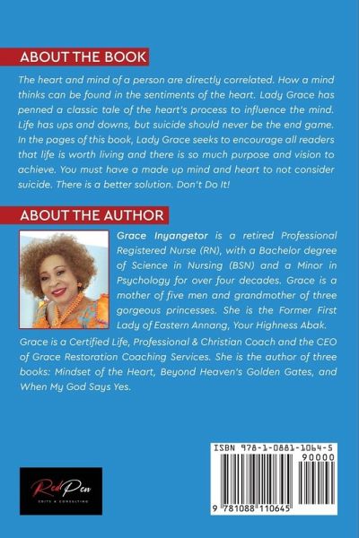 The heart and mind of a person are directly correlated. How a mind thinks can be found in the sentiments of the heart. Lady Grace has penned a classic tale of the heart's process to influence the mind. Life has ups and downs, but suicide should never be the end game. In the pages of this book, Lady Grace seeks to encourage all readers that life is worth living and there is so much purpose and vision to achieve. You must have a made up mind and heart to not consider suicide. There is a better solution. Don't Do It! Grace Inyangetor is a retired Professional Registered Nurse (RN), with a Bachelor degree of Science in Nursing (BSN) and a Minor in Psychology for over four decades. Grace is a mother of five men and grandmother of three gorgeous princesses. She is the Former First Lady of Eastern Annang, Your Highness Abak. Grace is a Certified Life, Professional & Christian Coach and the CEO of Grace Restoration Coaching Services. She is the author of three books: Mindset of the Heart, Beyond Heaven's Golden Gates, and When My God Says Yes.