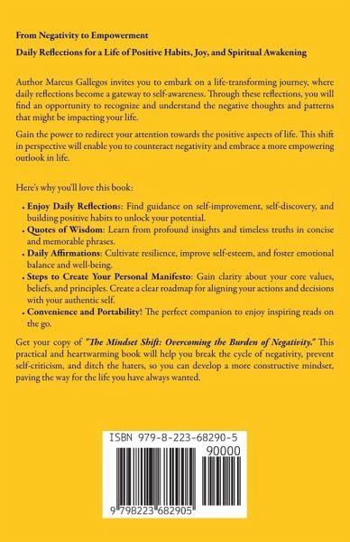 From Negativity to Empowerment Daily Reflections for a Life of Positive Habits, Joy, and Spiritual Awakening Author Marcus Gallegos invites you to embark on a life-transforming journey, where daily reflections become a gateway to self-awareness. Through these reflections, you will find an opportunity to recognize and understand the negative thoughts and patterns that might be impacting your life. Gain the power to redirect your attention towards the positive aspects of life. This shift in perspective will enable you to counteract negativity and embrace a more empowering outlook in life. Here's why you'll love this book:Enjoy Daily Reflections: Find guidance on self-improvement, self-discovery, and building positive habits to unlock your potential. Quotes of Wisdom: Learn from profound insights and timeless truths in concise and memorable phrases. Daily Affirmations: Cultivate resilience, improve self-esteem, and foster emotional balance and well-being. Steps to Create Your Personal Manifesto: Gain clarity about your core values, beliefs, and principles. Create a clear roadmap for aligning your actions and decisions with your authentic self. Convenience and Portability! The perfect companion to enjoy inspiring reads on the go. Get your copy of "The Mindset Shift: Overcoming the Burden of Negativity." This practical and heartwarming book will help you break the cycle of negativity, prevent self-criticism, and ditch the haters, so you can develop a more constructive mindset, paving the way for the life you have always wanted. Order your book today!