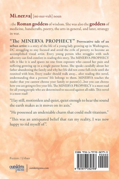 "The MINERVA PROPHECY" Provocative tale of an urban artist is a story of the life of a young lady growing up in Washington, DC struggling to stay focused and avoid the evils of poverty to become an accomplished visual artist. Every young person who struggles with such adversity can find comfort in reading this story. The MINERVA PROPHECY tells it like it is and spares no one from exposure who caused her pain and suffering growing up in a single parent home. She speaks candidly about her father abandoning the family and why her life did not come full circle until she reunited with him. Every reader should walk away... after reading this novel, understanding that a persons' life belongs to them. MINERVA teaches the reader that you cannot choose your family or parent(s)...but you can choose how you are going to live your life. The MINERVA PROPHECY is a must read for all young people who are determined to succeed against all odds. This novel is a must read! "I lay still, motionless and quiet, quiet enough to hear the sound the earth makes as it moves on its axis." "He possessed an undeniable charm that could melt titanium." "This was an antiquated belief that ran my reality, I was now happy to rid myself of".