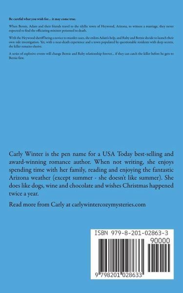 Be careful what you wish for… it may come true. When Bernie, Adam and their friends travel to the idyllic town of Heywood, Arizona, to witness a marriage, they never expected to find the officiating minister poisoned to death. With the Heywood sheriff being a novice to murder cases, she enlists Adam's help, and Ruby and Bernie decide to launch their own side investigation. Yet, with a near-death experience and a town populated by questionable residents with deep secrets, the killer remains elusive. A series of explosive events will change Bernie and Ruby relationship forever… if they can catch the killer before he gets to Bernie first.