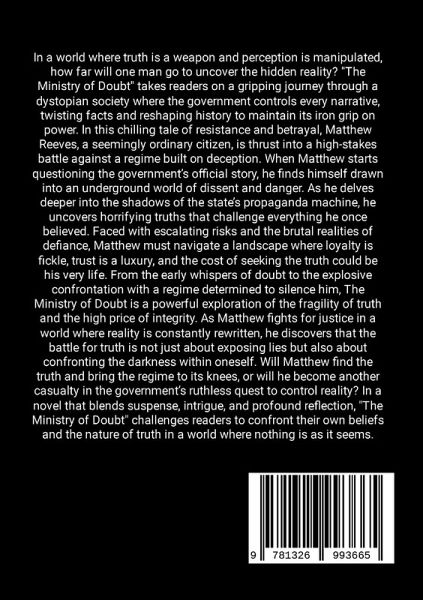 In a world where truth is a weapon and perception is manipulated, how far will one man go to uncover the hidden reality? "The Ministry of Doubt" takes readers on a gripping journey through a dystopian society where the government controls every narrative, twisting facts and reshaping history to maintain its iron grip on power. In this chilling tale of resistance and betrayal, Matthew Reeves, a seemingly ordinary citizen, is thrust into a high-stakes battle against a regime built on deception. When Matthew starts questioning the government's official story, he finds himself drawn into an underground world of dissent and danger. As he delves deeper into the shadows of the state's propaganda machine, he uncovers horrifying truths that challenge everything he once believed. Faced with escalating risks and the brutal realities of defiance, Matthew must navigate a landscape where loyalty is fickle, trust is a luxury, and the cost of seeking the truth could be his very life. From the early whispers of doubt to the explosive confrontation with a regime determined to silence him, "The Ministry of Doubt" is a powerful exploration of the fragility of truth and the high price of integrity. As Matthew fights for justice in a world where reality is constantly rewritten, he discovers that the battle for truth is not just about exposing lies but also about confronting the darkness within oneself. Will Matthew find the truth and bring the regime to its knees, or will he become another casualty in the government's ruthless quest to control reality? In a novel that blends suspense, intrigue, and profound reflection, "The Ministry of Doubt" challenges readers to confront their own beliefs and the nature of truth in a world where nothing is as it seems.