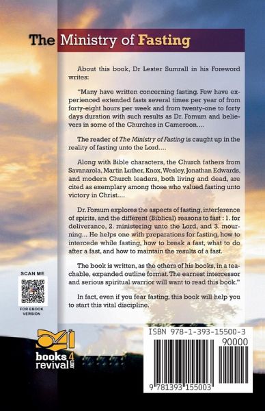 Dr. Fomum has written many books to date. From his personal journey with the Lord, he speaks as one who daily experiences what he writes. Concerning fasting, he says: "At the height of a long fast ... between the twenty-fifth and the fortieth day, the things of this world become absolutely meaningless ... my looks, qualifications, job, money, clothes, property, the presence of human beings ... accomplishments ... On the other hand, God was near and thoughts of heaven possessed me. I was anxious to walk in perfect holiness." Many have written concerning fasting. Few have experienced extended fasts several times per year of from forty-eight hours per week and from twenty-one to forty days' duration with such results as Dr. Fomum and believers in some of the Churches in Cameroon. "Each fasts according to his strength," each fasts drinking water only. The reader of The Ministry of Fasting is caught up in the reality of fasting unto the Lord on behalf of men leading tragic lives and nations facing tragic consequences of their sins or against the forces of evil in the world. As light is shed on the biblical teachings of The Ministry of Fasting, one is challenged with the evidence of the need to make an acceptable fast unto the Lord. Along with Bible characters, the Church fathers from Savanarola, Martin Luther, Knox, Wesley, Jonathan Edwards, and modern Church leaders, both living and dead, are cited as exemplary among those who valued fasting unto victory in Christ. Dr. Fomum explores the aspects of fasting, interference of spirits, and the different reasons to fast: for deliverance, ministering unto the Lord, and mourning... He helps one with preparations for fasting, how to intercede while fasting, how to break a fast, what to do after a fast, and how to maintain the results of a fast. The book is written, as the others of his books, in a teachable, expanded outline format. The earnest intercessor and serious spiritual warrior will want to read this book. DR. LESTER SUMRALL