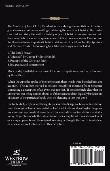The Ministry of Jesus Christ, the Messiah is an abridged compilation of the four gospelsone continuous writing containing the words of Christ so the reader can read and study the entire ministry of Jesus Christ in one continuous fluid document. Also included in appendices are biblical presentations of Creation and the Flood and other important Christian statements of belief, such as the Apostolic and Nicene Creeds. The following four Bible study topics are included: 1. The Lords Prayer 2. Messiah by George Frideric Handel 3. Precepts of the Christian faith 4. Joy, peace, and contentment Modern day English translations of the four Gospels were used or referenced by the author. When the Apostles spoke of the same event, their words were blended into one account. The author worked to ensure thought or meaning from Scripture containing a description of an event was not lost. If not absolutely clear that the same event was being written about, or if the event could not logically be taken out of context of the particular book, then no blending of text was done. Footnotes help explain key thoughts presented in Scripture because translation from the original Greek does not often lend itself to the modern English language nor common grammatical form, hence the many different translations available today. Regardless of whether a translation uses a very literal translation of Greek or a simpler paraphrase, the original meaning or thought the Lord intended can be unclear without reference to other Scripture.