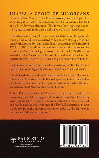 IN 1768, A GROUP OF MINORCANS disembarked in New Smyrnea, Florida, arriving on eight ships. They were brought to work as indentured servants for Dr. Andrew Turnbull at his New Smyrnea plantation. This form of servitude was a common practice during the early development of the United States. "The Minorcan's Triumph" is an historical fiction that brings to life many of the conditions associated with a colony of people working on a Florida plantation during the British occupation of Florida from 1763 to 1783. The Minorcan colonists made up the largest colony to come to America during the colonial era. Over 1,200 Minorcans arrived in New Smyrnea. Sadly, 964 died and were buried on the plantation from 1768 to 1777. Not one grave has ever been found. Their history during the nine years they worked for Dr. Turnbull has not been written to the degree their history should be known and studied. This fictional story tells about things that could have been. Hopefully, this story and the ones that follow will generate interest in scholars and historians to uncover the mysteries that are buried in the sun drenched sand of New Smyrna Beach, Florida. Robert P. Jones, now in his 91st year, is steadfastly committed to uncovering the final resting place of Catarina Usina, his wife's fourth great-grandmother. Catarina was among the Minorcans who died and was buried on what was once the Turnbull plantation, an area that is now primarily known as New Smyrna Beach, Florida. Jones is only asking, "Where is her grave?"