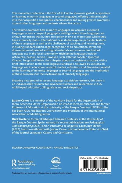 The volume examines how minority languages are acquired as second languages across a range of geographic settings where these languages are unique minorities; that is, they are spoken in one or more states where they have a minority status. International case studies explore particular features of these languages as well as the challenges of teaching and learning them, including standardization, legal recognition at all educational levels, the dissemination of printed and digital materials and more or less limited language use in the local community. Highlighted languages include Ashaninka, Basque, Frisian, Hawaiian, Irish, Isthmus Zapotec, Quechua Chanka, Tonga and Welsh. Eachchapter adopts a consistent structure, with a brief introduction to the sociolinguistic landscape, followed by sections on language use in education, research studies, reflections and discussions related to the learning of minority languages as second languages and the implication of these processes for the revitalization of minority languages.
