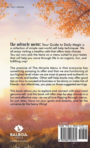 The Miracle Menu: Your Guide to Daily Magic is a collection of simple real-world self-help techniques. We all enjoy visiting a healthy caf that offers tasty choices. You can now pick the items on a menu suited to your tastes that will help you move through life in an organic, fun, and fulfilling way! The premise of The Miracle Menu is that everyone has something amazing to offer and that we are functioning at our highest level when we are most at peace and authentic in our minds and bodies. Other self-help books may offer good tips on how to succeed at business or be skinny or make lots of friendsbut oftentimes, you pass on those suggested servings. This book allows you to explore and connect with your most genuine self, and this book will offer step-by-step choices in a fun and effective wayas we all love flipping through menus. So just relax, focus on your goals and dreams, and let the universe do the heavy lifting!