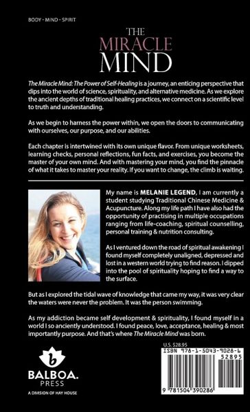 The Miracle Mind: The Power of Self-Healing is a journey, an enticing perspective that dips into the world of science, spirituality, and alternative medicine. As we explore the ancient depths of traditional healing practices, we connect on a scientific level to truth and understanding. As we begin to harness the power within, we open the doors to communicating with ourselves, our purpose, and our abilities. Each chapter is intertwined with its own unique flavor. From unique worksheets, learning checks, personal reflections, fun facts, and exercises, you become the master of your own mind. And with mastering your mind, you find the pinnacle of what it takes to master your reality. If you want to change, the climb is waiting.