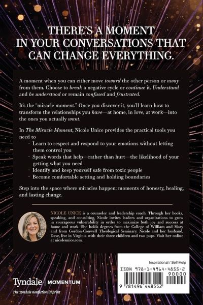 There's a moment in every conversation that can change the whole relationship. A moment when you can either move toward the other person or away from them. Choose to break a negative cycle or continue it. Understand and be understood or remain confused and frustrated. It's the ?miracle moment.? And once you learn how to recognize and respond to it, it holds the power to help transform the relationships you have?at home, in love, and at work?into the ones you really want. In The Miracle Moment, Nicole Unice helps you discover the practical tools toLearn to respect and respond to your emotions without letting them control you Speak words that help?rather than hurt?the likelihood of your getting what you need Identify and keep yourself safe from toxic people Become comfortable setting and holding boundaries Be your best self even when you're tempted to shut up, blow up, or give up Step into the space where miracles happen. Your miracle moments are waiting for you: moments of honesty; moments of healing; moments of renewal and lasting change. (Don't miss the companion Miracle Moment DVD Experience and Miracle Moment Participant's Guide, perfect for small groups or individuals wanting to go deeper!)