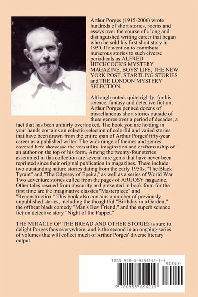 THE MIRACLE OF THE BREAD AND OTHER STORIES is a collection of twenty-four unique and varied stories by Arthur Porges (1915-2006). Among the outstanding stories assembled in this volume are "Masterpiece," "The Fiery Patriot" and "The Black Tyrant," reprinted for the first time since their original appearances in magazines. Also included in this book are several previously unpublished tales such as "Night of the Puppet" and "Morning After." Editor Richard Simms also provides an introduction and commentary on the stories.