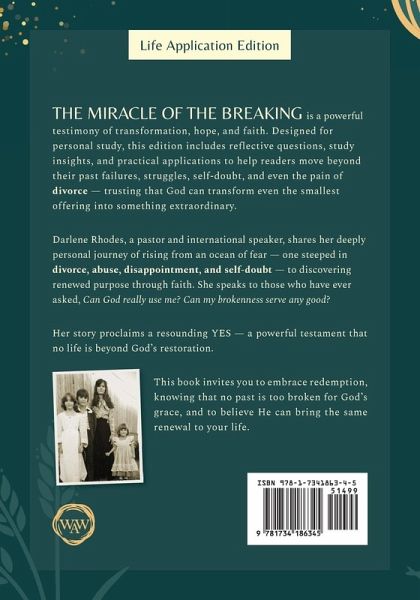 THE MIRACLE OF THE BREAKING is a powerful testimony of transformation, hope, and faith. Designed for personal study, this edition includes reflective questions, study insights, and practical applications to help readers move beyond their past failures, struggles, self-doubt, and even the pain of divorce - trusting that God can transform even the smallest offering into something extraordinary. Darlene Rhodes, a pastor and international speaker, shares her deeply personal journey of rising from an ocean of fear - one steeped in divorce, abuse, disappointment, and self-doubt - to discovering renewed purpose through faith. She speaks to those who have ever asked, Can God really use me? Can my brokenness serve any good? Her story proclaims a resounding YES - a powerful testament that no life is beyond God's restoration. This book invites you to embrace redemption, knowing that no past is too broken for God's grace, and to believe He can bring the same renewal to your life
