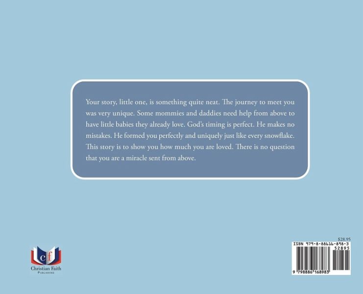 Your story, little one, is something quite neat. The journey to meet you was very unique. Some mommies and daddies need help from above to have little babies they already love. God's timing is perfect. He makes no mistakes. He formed you perfectly and uniquely just like every snowflake. This story is to show you how much you are loved. There is no question that you are a miracle sent from above.