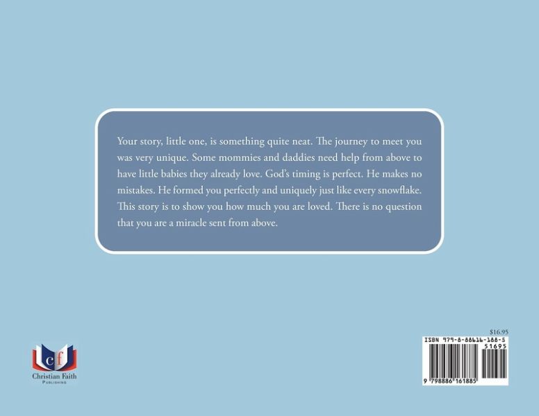 Your story, little one, is something quite neat. The journey to meet you was very unique. Some mommies and daddies need help from above to have little babies they already love. God's timing is perfect. He makes no mistakes. He formed you perfectly and uniquely just like every snowflake. This story is to show you how much you are loved. There is no question that you are a miracle sent from above.