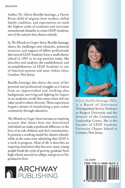 Author Dr. Gloria Bonilla-Santiago, a Puerto Rican child of migrant farm workers, defied family, tradition, and expectations to reach the highest ranks of academia and overcome monumental obstacles to create LEAP Academy, one of the nation's best charter schools. In The Miracle on Cooper Street, Bonilla-Santiago shares the challenges and obstacles, potential resources, and support of fellow professionals that moved LEAP Academy from a small charter school in 1997 to its top position today. She describes and analyzes the establishment and accomplishments of LEAP Academy in one of America's poorest and most violent cities, Camden, New Jersey. Bonilla-Santiago also shares the story of her personal and professional struggles as a Latina from an impoverished and working-class background, surviving and fighting for respect in an academic world that many times did not value racial or ethnic diversity. Those experiences forged a dream of transforming a poor urban community through education. The Miracle on Cooper Street narrates an inspiring account that shows how one determined individual can make a profound difference in the lives of at-risk children and their communities. It presents a working model for charter schools, while at the same time admitting that LEAP is a work in progress. Most of all, it describes an inspiring institution that has seen many young people break the cycle of poverty, graduate from high school, succeed in college, and go on to live productive lives.