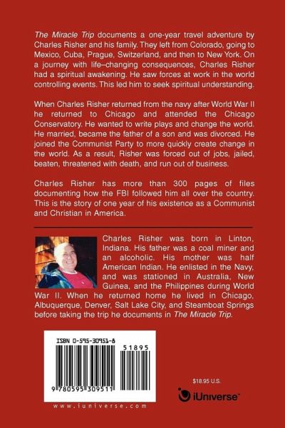 The Miracle Trip documents a one-year travel adventure by Charles Risher and his family. They left from Colorado, going to Mexico, Cuba, Prague, Switzerland, and then to New York. On a journey with life-changing consequences, Charles Risher had a spiritual awakening. He saw forces at work in the world controlling events. This led him to seek spiritual understanding. When Charles Risher returned from the navy after World War II he returned to Chicago and attended the Chicago Conservatory. He wanted to write plays and change the world. He married, became the father of a son and was divorced. He joined the Communist Party to more quickly create change in the world. As a result, Risher was forced out of jobs, jailed, beaten, threatened with death, and run out of business. Charles Risher has more than 300 pages of files documenting how the FBI followed him all over the country. This is the story of one year of his existence as a Communist and Christian in America.