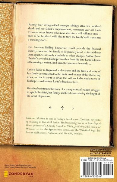 Raising four strong-willed younger siblings after her mother's death and her father's imprisonment, seventeen-year-old Lanie Freeman never knows what new adventure will roll into view---such as her brother's wild idea to turn the family's old truck into a traveling store. The Freeman Rolling Emporium could provide the financial security Lanie and her family so desperately need, or it could tear them apart. Yet it's only a prelude to other changes. Author Brent Hayden's arrival in Fairhope breathes fresh life into Lanie's dream of becoming a writer. And then the hammer descends ... Lanie's father is diagnosed with cancer, and the faith and unity of her family are stretched to the limit. And on top of this shattering news, a crisis is about to strike that will rock the whole town of Fairhope---and shatter Lanie's dreams of love. The Miracle continues the story of a young woman's valiant struggle to uphold her faith, her family, and her dreams during the height of the Great Depression.