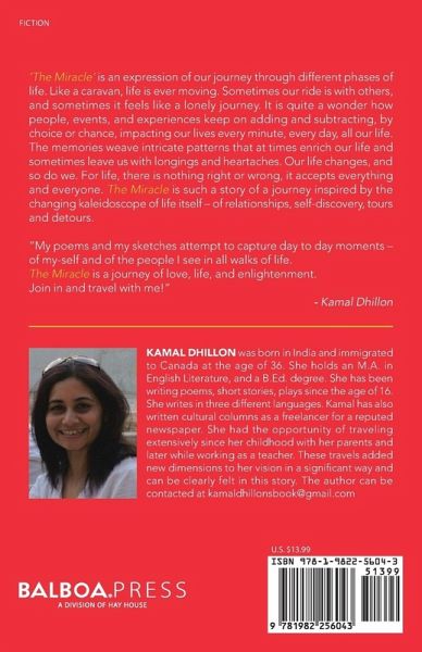 'The Miracle' is an expression of our journey through different phases of life. Like a caravan, life is ever moving. Sometimes our ride is with others, and sometimes it feels like a lonely journey. It is quite a wonder how people, events, and experiences keep on adding and subtracting, by choice or chance, impacting our lives every minute, every day, all our life. The memories weave intricate patterns that at times enrich our life and sometimes leave us with longings and heartaches. Our life changes, and so do we. For life, there is nothing right or wrong, it accepts everything and everyone. The Miracle is such a story of a journey inspired by the changing kaleidoscope of life itself - of relationships, self-discovery, tours and detours. "My poems and my sketches attempt to capture day to day moments - of my-self and of the people I see in all walks of life. The Miracle is a journey of love, life, and enlightenment. Join in and travel with me!" - Kamal Dhillon