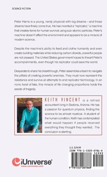 Peter Harris is a young, nerdy physicist with big dreams-and those dreams have finally come true. He has invented a "replicator," a machine that creates items for human survival using sub-atomic particles. Peter's machine doesn't affect the environment and appears to be a miracle of modern science. Despite the machine's ability to feed and clothe humanity and even create building materials while reducing carbon dioxide, powerful people are not pleased. The United States government hopes to thwart Peter's accomplishments, even though his replicator could save the world. Desperate to share his breakthrough, Peter assembles a team to navigate the pitfalls of creating powerful enemies. They must now represent the resistance and survive all attempts to end replicator technology. In an ironic twist of fate, this miracle of life-changing proportions holds the seeds of tragedy.