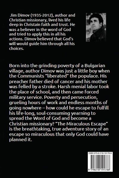 In our present world of refugees, wars, turmoil and political asylum, the story of Jim Dimov's incredible escape from an oppressive Bulgarian communist regime is still relevant after almost fifty years. Bulgaria has long been one of the poorest countries of Europe. After the second world war it also became known for being ruled by a brutal, hard line Marxist regime that ruthlessly crushed dissent and persecuted ethnic and religious minorities. Small communities of evangelical Christians managed to survive, a legacy of American missionaries earlier in the twentieth century, but they were viewed with suspicion by authorities. In every age there have been courageous individuals who cannot be constrained by borders, relentlessly pushing to live in a place of greater freedom and opportunity. Jim Dimov was one of those people, propelled by a driving need to practice his faith freely, the will to try every possibility, and the faith to be guided by his unshakable belief in a higher power. Even after escaping Bulgaria, he and other refugees in Greece were viewed with mistrust. It was a cruel irony that they were often suspected of being Communist infiltrators. Jim Dimov believed that God's plan was for him to ultimately relocate to America and become a Christian Missionary. He soon discovered that life in America was different than he had imagined, but he kept his faith and his strong work ethic, and was able to make a new life for himself. This incredible story has been repeated countless times. But nonetheless, in many societies, fear and suspicion of newcomers who have fled from fear, tyranny and corruption remains. Jim Dimov's Miraculous Escape remains a testament to the yearning to breathe free! This book will appeal to those interested in the refugee experience in the West during the Cold War, Christians looking to strengthen their faith during adversity, and students of immigration in 1960s America.