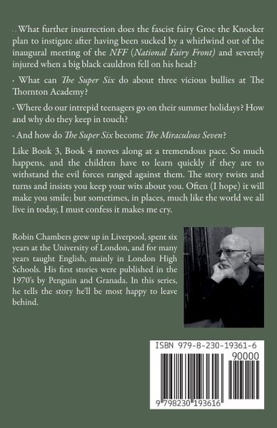 · Where have the aliens hidden the children's memories of their visit to the far side of the moon? · Why does dark lord crime boss and wicked archwizard Octavius Mortlake want to murder Gordon and his friends, and what evil plan does he have to do so? · Can The Super Six get the better of a powerful wizard assassin, and who does Titus Temple have locked up in Little Titus Close ? · Who has Mortlake kept enslaved in his basement laboratory for the last twelve years, and what difference will that make to the lives of Wynfor the Wandmaker and Gordon's friend Nick? · How can WARD - the Wandholders Alliance for the Return of Democracy - organise effective resistance against the Council of Thirteen regional crime families? · What further insurrection does the fascist fairy Groc the Knocker plan to instigate after having been sucked by a whirlwind out of the inaugural meeting of the NFF (National Fairy Front) and severely injured when a big black cauldron fell on his head? · What plan does Gordon hatch to take Titus Temple out of the equation and simultaneously help the primitive humans on The Planet of the Apes? · Who is Enzo Potenza, and what kind of a threat does he pose Gordon, Grace, Nick, Miranda and WARD? · After Mortlake's untimely demise, what plan does his enforcer Adolfo Aragon hatch to kill the four teenagers, and what has it to do with school dinners? · What can The Super Six do about three vicious bullies at The Thornton Academy? · Where do our intrepid teenagers go on their summer holidays? How and why do they keep in touch? · And how do The Super Six become The Miraculous Seven?. Like Book 3, Book 4 moves along at a tremendous pace: so much happens, and the children have to learn quickly if they are to withstand the evil forces ranged against them. The story twists and turns and insists you keep your wits about you. Often (I hope) it will make you smile; but sometimes, in places, much like the world we all live in today, I must confess it makes me cry.